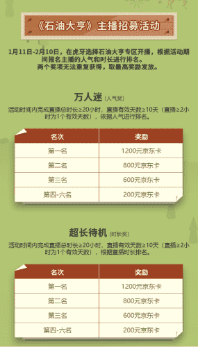 除了“油王”争霸赛,,,,精英主播招募活动亦同步开启!!赛事分时长奖和人气奖,,,,奖励同样丰厚!!!!