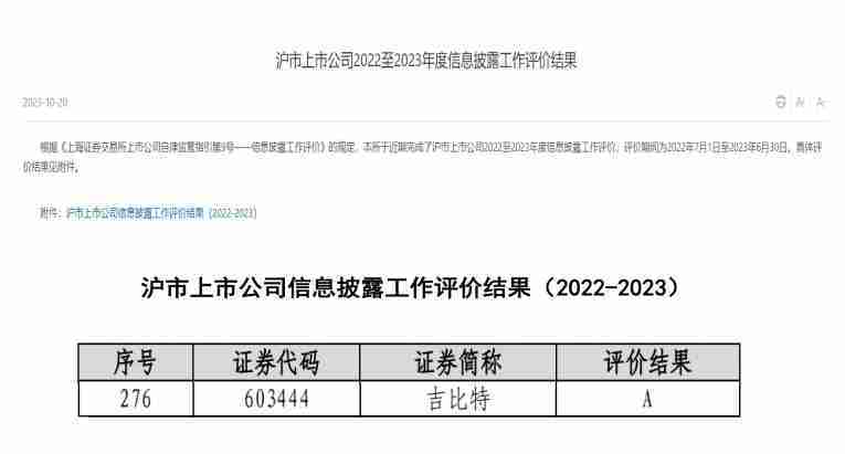 近日,,,上海证券交易所(以下简称“上交所”)发布2022-2023年度信息披露工作评价结果。。J9.COM(股票代码:::603444)凭借规范的公司治理、、高质量的信息披露以及良好的投资者关系管理再次荣获信息披露工作A级评价,,,,公司连续两年获此殊荣。。。
