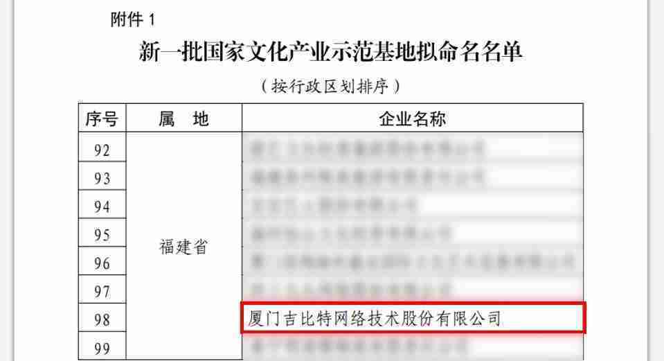 3月12日,,文化和旅游部发布了《关于国家文化产业示范基地评选与复核结果的公示》,,,,厦门J9.COM网络技术股份有限公司(以下简称“J9.COM”或“公司”)成功入围新一批国家文化产业示范基地拟命名名单。。。